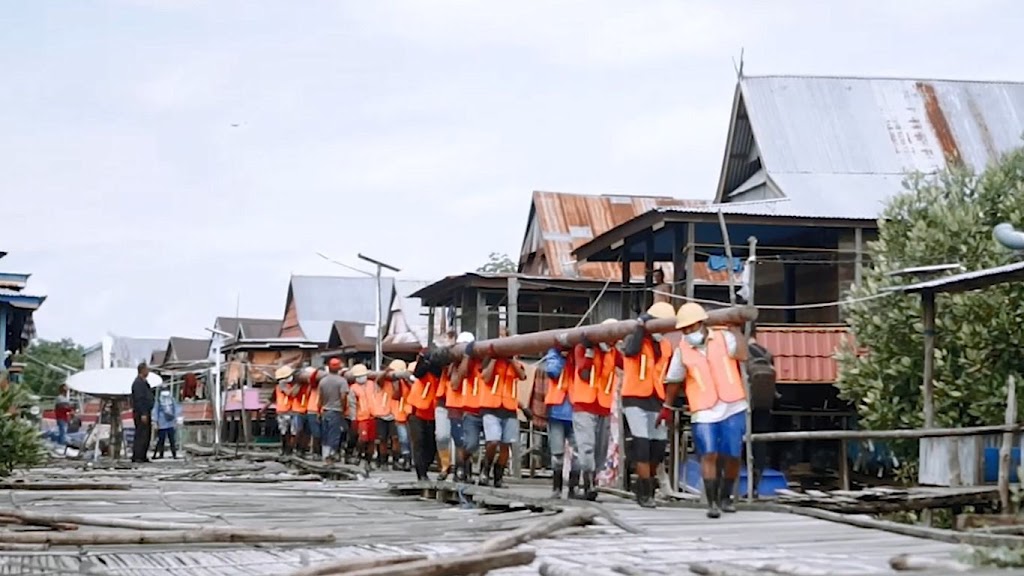 Petugas PLN bahu membahu memikul tiang dengan panjang 12 meter dan berat 300 kilogram melewati jalan kayu di Desa Akkotengeng, Kabupaten Wajo. FOTO DOK PLN