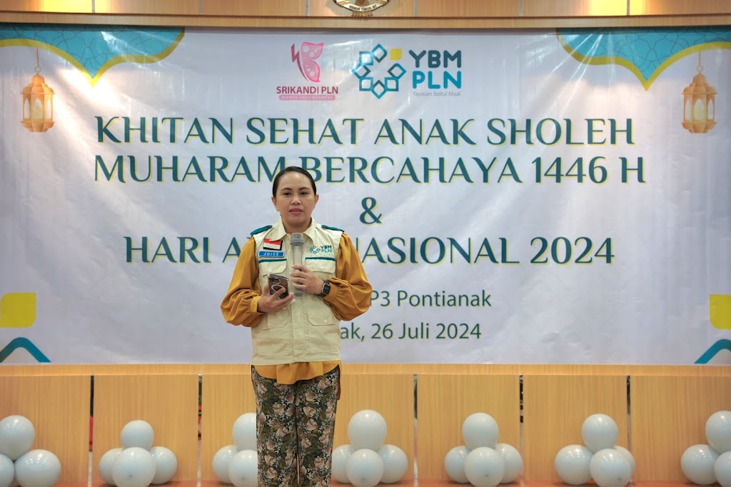 | General Manager PLN UID Kalimantan Barat, Joice Lanny Wantania memberikan sambutan pada acara “Khitan Sehat Anak Sholeh, Muharam Bercahaya 1446 H & Hari Anak Nasional” (26/07). FOTODOKPLN |